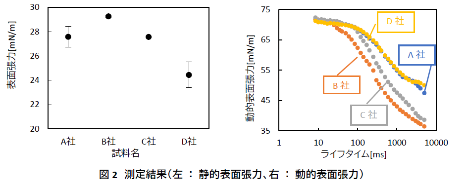 4種の洗濯用洗剤をそれぞれ使用時の濃度に希釈した溶液を調整し、静的表面張力(プレート法)および動的表面張力を測定した。静的表面張力は経時変化を測定したうえで、平衡状態に達すると考えられる20秒時点の値を比較した(図2)。その結果、D社が最も低く、B社が最も高い値を示し、平衡状態における界面活性効果はD社が最も高いことが明らかになった。一方、動的表面張力では、ライフタイムに対する表面張力の変化を評価したところ、B社が最も速く表面張力の低下を示し、界面への吸着速度が速いことが確認された。この結果、静的表面張力とは異なる大小関係が得られた。