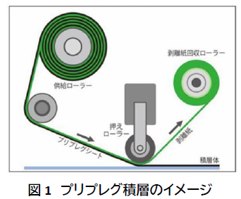 炭素繊維プリプレグは、炭素繊維に樹脂を含侵させたシート状の複合材料であり、軽量で高強度・高剛性を有することから、金属に代わる材料として幅広い分野で利用されている。プリプレグ積層体は、自動積層装置によって形成され、同時に剥離紙が自動的に除去・回収される(図1)。このとき、剥離紙は容易に剥がれることが求められるが、剥離強度が小さすぎると使用前に剥がれてしまい、大きすぎるとシリコーン付着等の品質トラブルの要因となる。そのため、剥離強度を最適な状態に管理することが重要な課題となる。