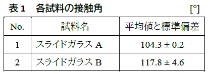 まず、接触角測定の結果を表1に示す。「スライドガラスA」および「スライドガラスB」ともに接触角が100°と高いことがわかる。また、平均値で見ると、「スライドガラスB」の方がわずかに高い接触角であるといえる。