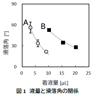次に、滑落角測定の結果を図1に示す。同一液量で滑落角を比較すると、「スライドガラスA」の方が「スライドガラスB」よりも明らかに小さい滑落角であることがわかる。つまり、「スライドガラスA」の方がより優れた滑落性(液除去性)を有するといえる。