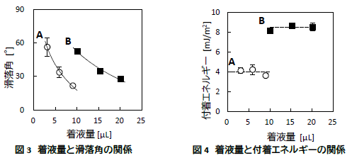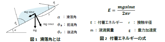 液滴をのせた固体を水平状態から徐々に傾斜させる時、液滴が滑落し始める際の傾斜角を滑落角といい、同じ液量では滑落角が小さいほど固体と液体の付着性が弱い(液除去性・滑落性が良い)といえる。しかし、液量や液量を揃えなければ比較することができないため、これらに左右されない指標として、付着エネルギーを提案する。