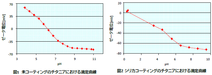 図1は未コーティングのチタニアの測定結果を示しており、等電点はpH6.2であることが分かる。これに対して、図2ではシリカコーティングのチタニアの測定結果を示しているが、等電点は一般的なシリカの等電点に近いpH2程度であり、酸側に移動したことが分かる。ZetaProbeでは、このようなpH滴定測定を30分以内に実施できる。また、図2は清浄なシリカ粒子と同じ滴定曲線であり、シリカがチタニアを完全にコーティングできているほど十分な厚さがあることがわかる。