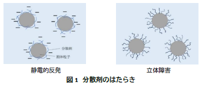塗料の貯蔵安定性や塗工時のムラの生じやすさ、セラミック分散液のろ過のしやすさなどの様々な過程において、分散安定性が関与する。一般的に、粒子表面に吸着して静電的反発や立体障害を生じさせる「分散剤」を使用して分散安定性を向上させる(図1)。従来は、この分散剤の最適な添加量を知るために、数水準の添加量を決めて分散液を調製して評価していたため、多くの試行回数や工数を費やしていた。