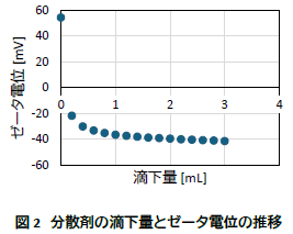 5 wt%アルミナ/水分散液を調製し、0.4 wt%ポリカルボン酸系分散剤水溶液を0.2 mLずつ、合計3.0 mLを滴定しながら測定した。滴定前のゼータ電位は正の値であったが、滴定を開始するとゼータ電位が大きく減少して負の値になり、添加量1.0 mL以降ではゼータ電位のプロットがほぼ横ばいになった。この結果から、正に帯電していた粒子表面に添加剤の分子が吸着し、1.0 mL以降では吸着が飽和したことが考えられる。