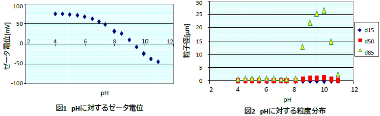 図1は、pHに対するゼータ電位の測定結果、図2はpHに対する粒度分布の測定結果を示す。本装置の粒度分布解析は体積基準であり、d15は小さい方から15%、d50は50%(中央値)、d85は85%の粒子径を示す。