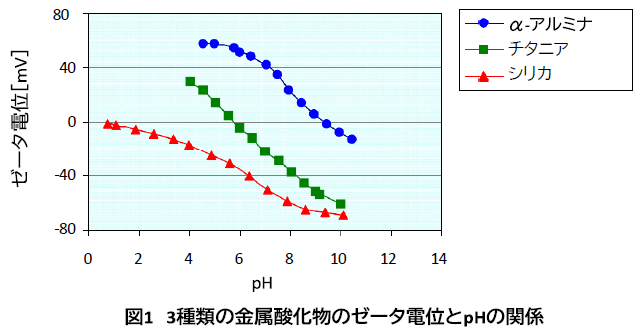 ゼータ電位の1つの用途は、目的の分散状態に合わせたpH範囲の見極めである。図1に、pHに対するアルミナ、チタニア、シリカのゼータ電位の測定結果を示す。アルミナはpH8以下で、チタニアはpH4以下またはpH8以上で、シリカはpH4以上で安定することがわかる。したがって、ZetaProbeにより凝集または分散しやすい分散液を作製するために必要なpH範囲の決定が簡単になったといえる。pH滴定の注意点として、この曲線は電解質の濃度や種類などの他の要因にも依存するため、分散液ごとで評価する必要がある。