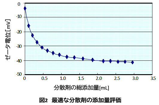 ゼータ電位のもう1つの用途は、分散剤の最適添加量の見極めである。分散剤の総添加量に対するゼータ電位のグラフにおいて、ゼータ電位が横ばいになった時点を、粒子表面が完全に分散剤で覆われた状態と判断する。図2に、アルミナ分散液に高分子電解質分散剤を添加した際のゼータ電位の測定結果を示す。この試料においては、約2.5 mLの添加後からゼータ電位がほぼ横ばいになっているため、最適添加量は約2.5 mLであるといえる。 非イオン物質による分散制御の場合も、粒子への吸着によりゼータ電位の絶対値が小さくなるため、ZetaProbeで最適添加量の見極めが可能である。